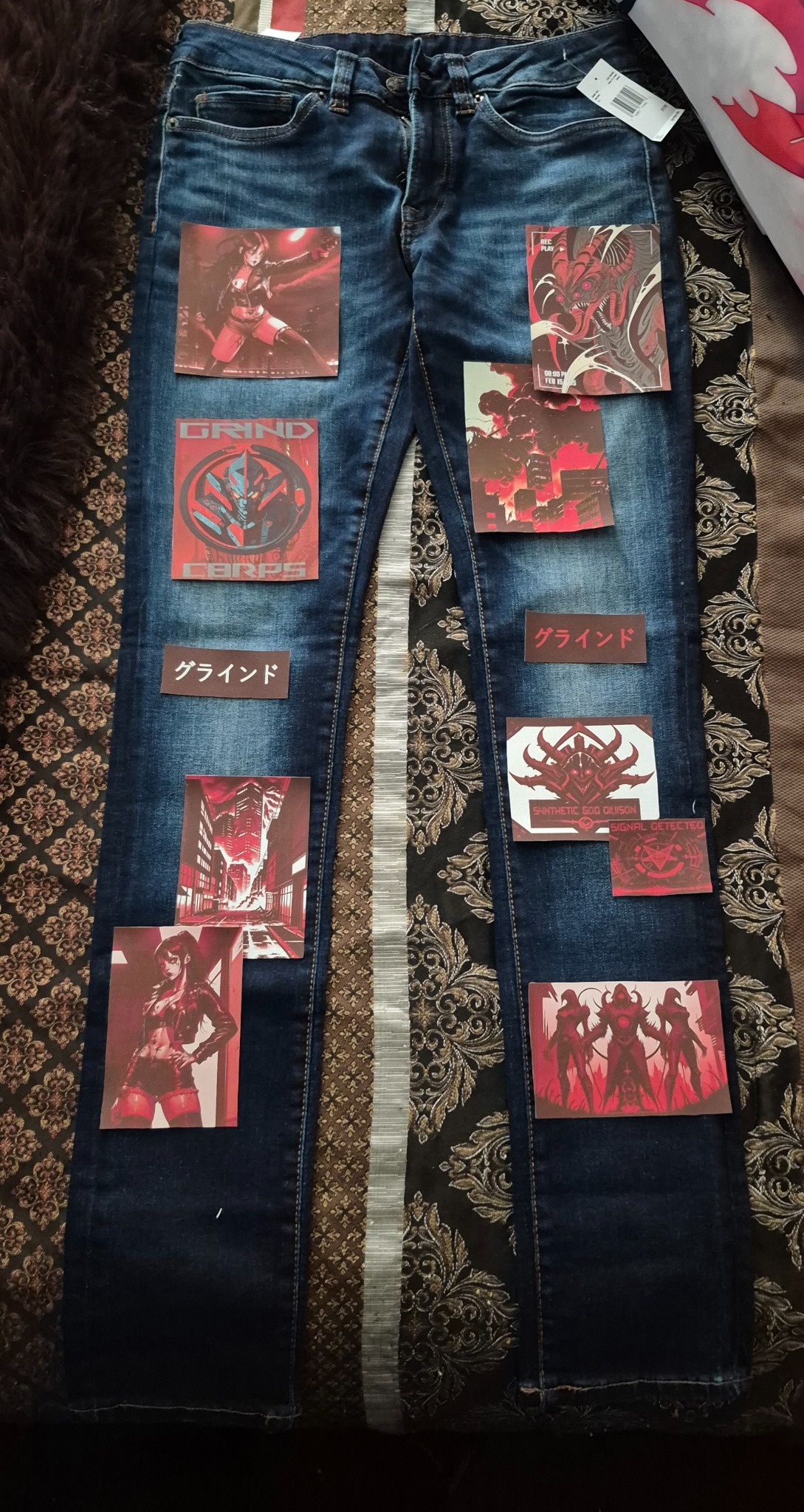 I basically tried to create my own anime storyboard on a pair of jeans, lol... I think they are really coming along. I did each patch in a red monochrome style for cohesion and I used a combination of hand drawing, AI, and real life pictures for the artwork.
